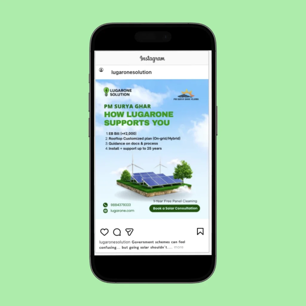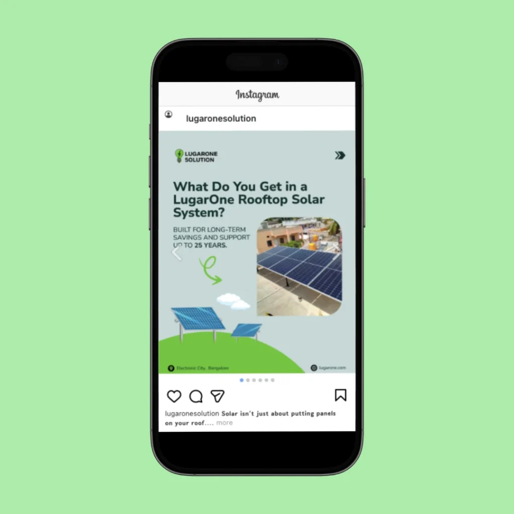 Lugarone is a Bengaluru-based solar installation brand focused on green and sustainable energy solutions. We supported their growth through location-focused performance marketing on a limited budget, improved their landing page and website conversion journey, and strengthened social media presence with consistent awareness-led content.